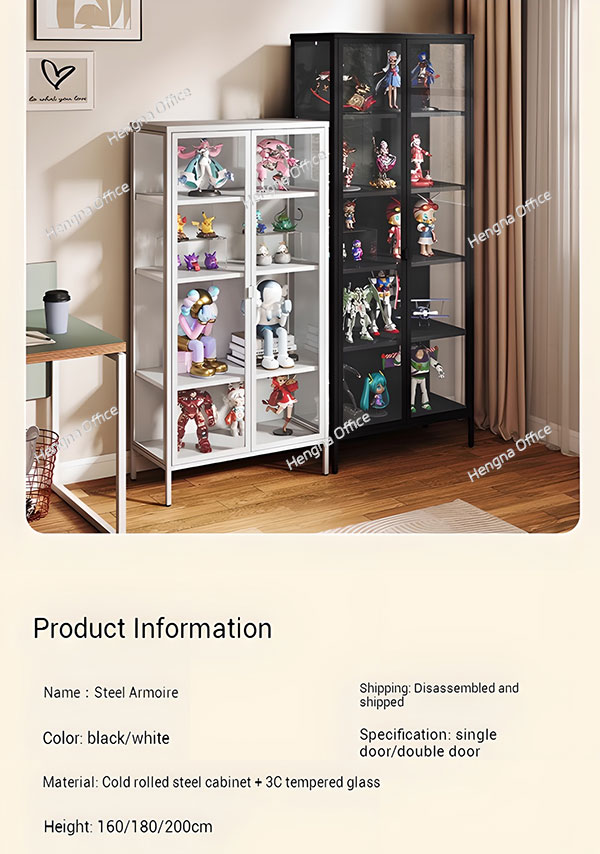 Our Glass Display Cabinet H2000W800D400mm features top-quality materials. The cabinet is built to last for years. The frame is constructed from durable cold-rolled steel. This ensures stability and strength. The doors are made from 3C tempered glass. This glass is both beautiful and resilient. It provides crystal-clear visibility of your items. The Glass Display Cabinet H2000W800D400mm can withstand daily use without losing its elegance.